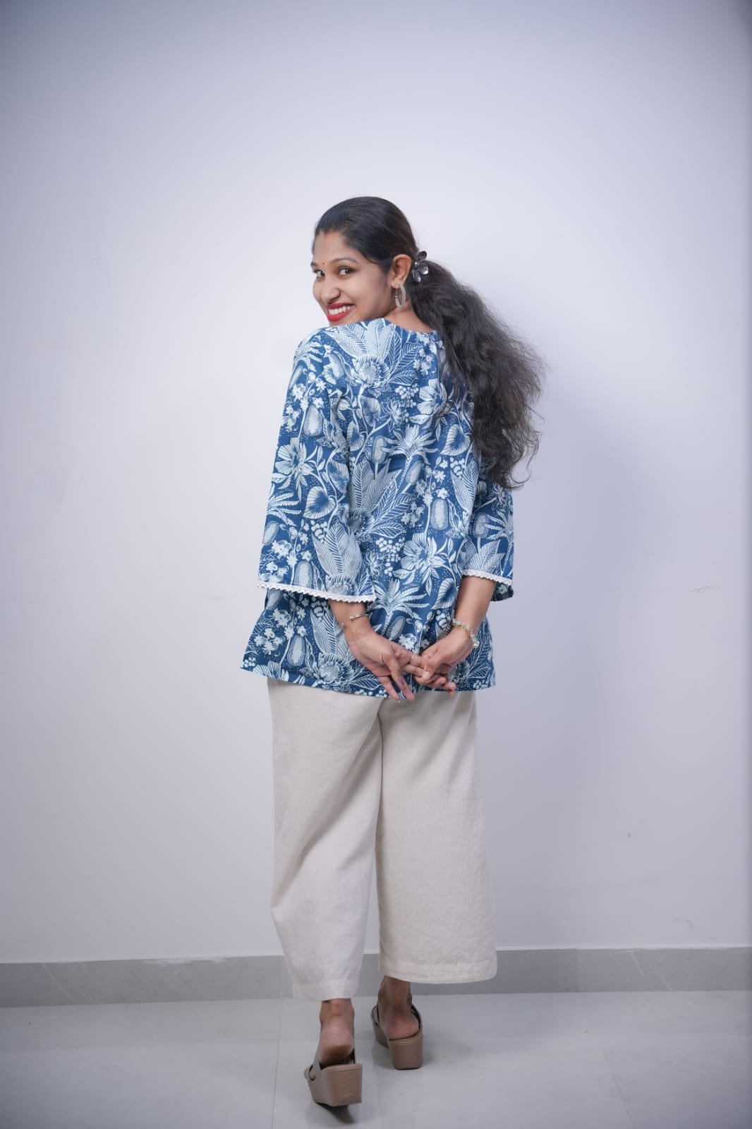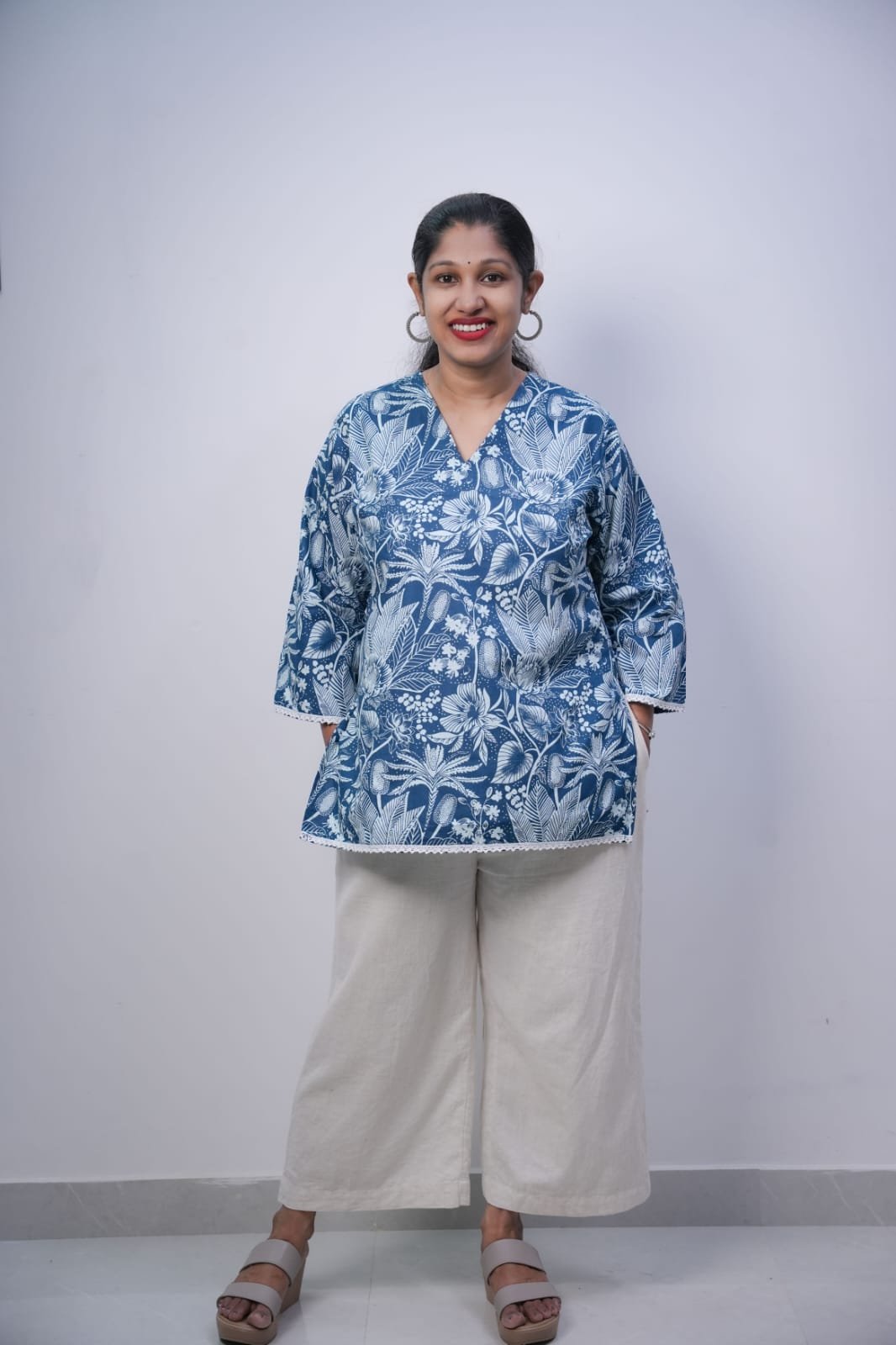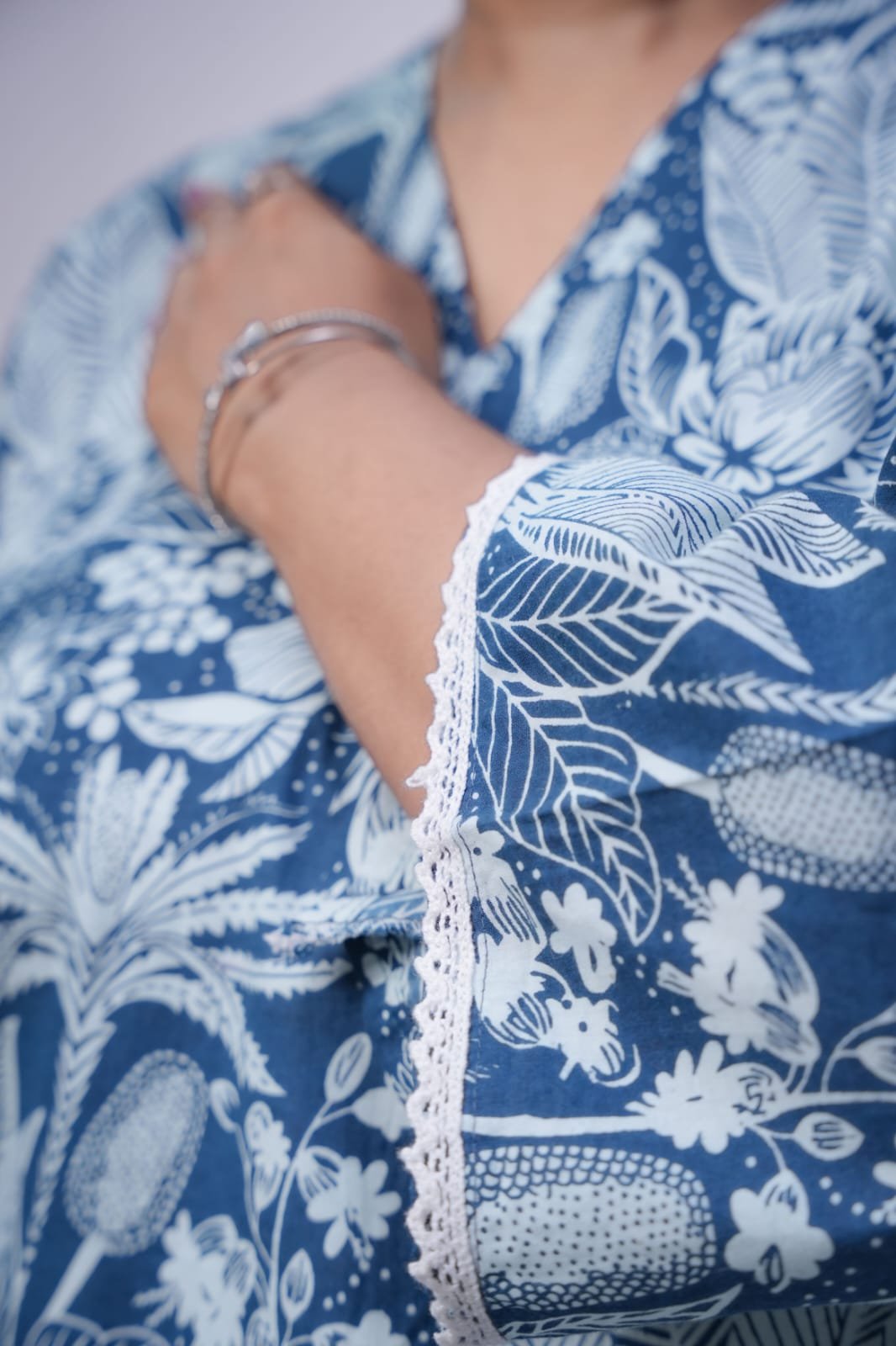 FEATURING STYLISH PAKISTANI SLEEVES, IT ADDS A MODERN YET GRACEFUL TOUCH TO YOUR LOOK. THE BEAUTIFUL BLUE COLOR WITH ELEGANT FLORAL PRINT ENHANCES ITS FRESH AND TRENDY APPEARANCE. THE RELAXED FIT MAKES IT IDEAL FOR CASUAL OUTINGS, OFFICE WEAR, OR HOME COMFORT. PAIR IT WITH PALAZZOS, JEANS, OR LEGGINGS FOR A VERSATILE OUTFIT.